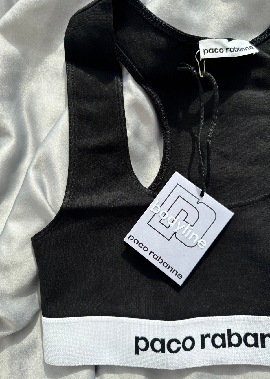 The signature paco rabanne logo is prominently displayed across the contrasting white elastic underband, delivering a bold yet refined statement. A fusion of sporty ease and high-end aesthetics, this piece captures the timeless allure of Paco Rabanne’s modern bodywear line.